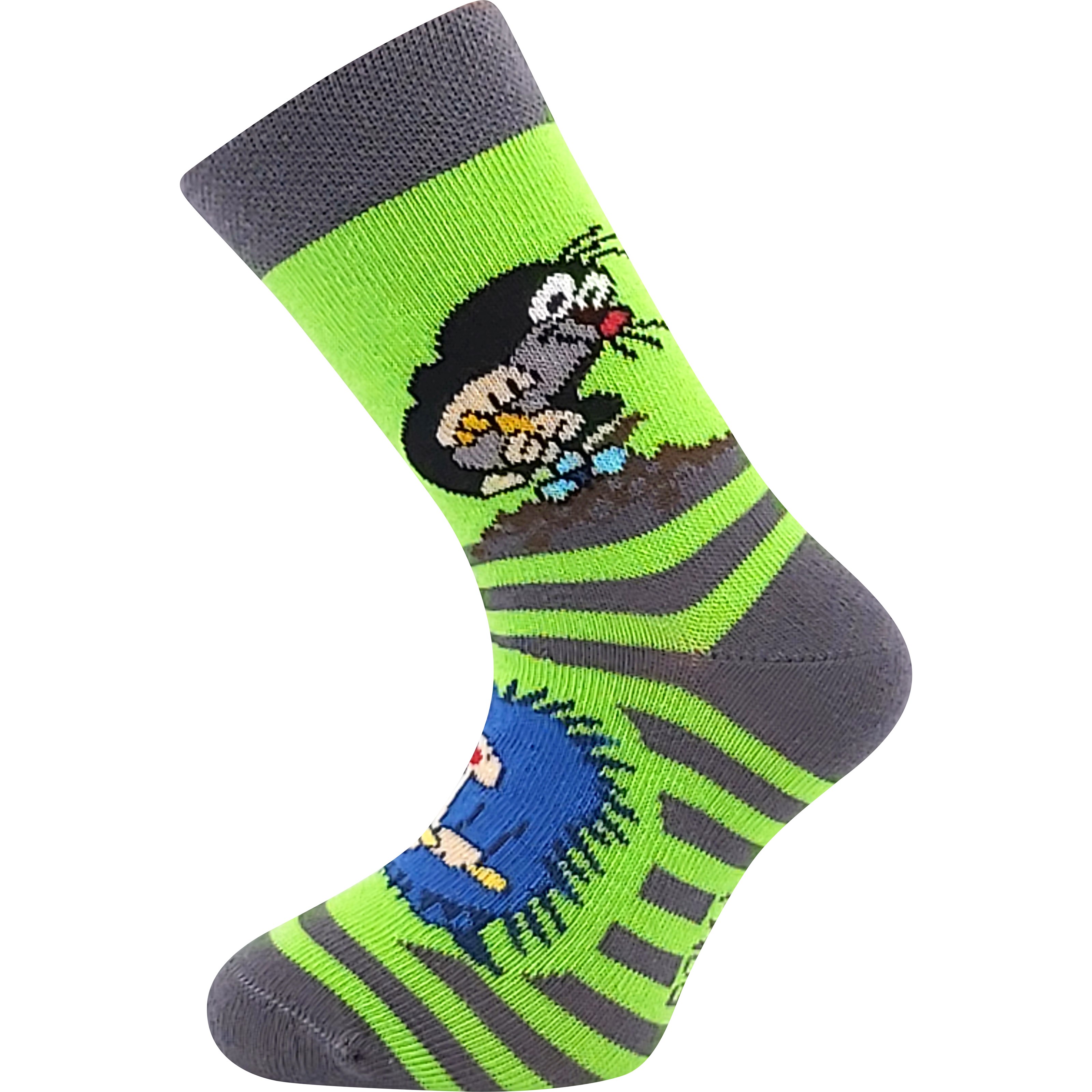 Boys' socks are knitted from comfortable cotton with elastane, making them pleasant to the skin while also being flexible and retaining their shape well. These thin and soft socks are of classic height and have a soft, flexible cuff that does not constrict. Delight your children with these cheerful socks, suitable for all-day wear. We sell these picture socks in a value pack of 3 pairs in a mix of colours for boys, featuring the cute Mole character by artist Zdeněk Miler.