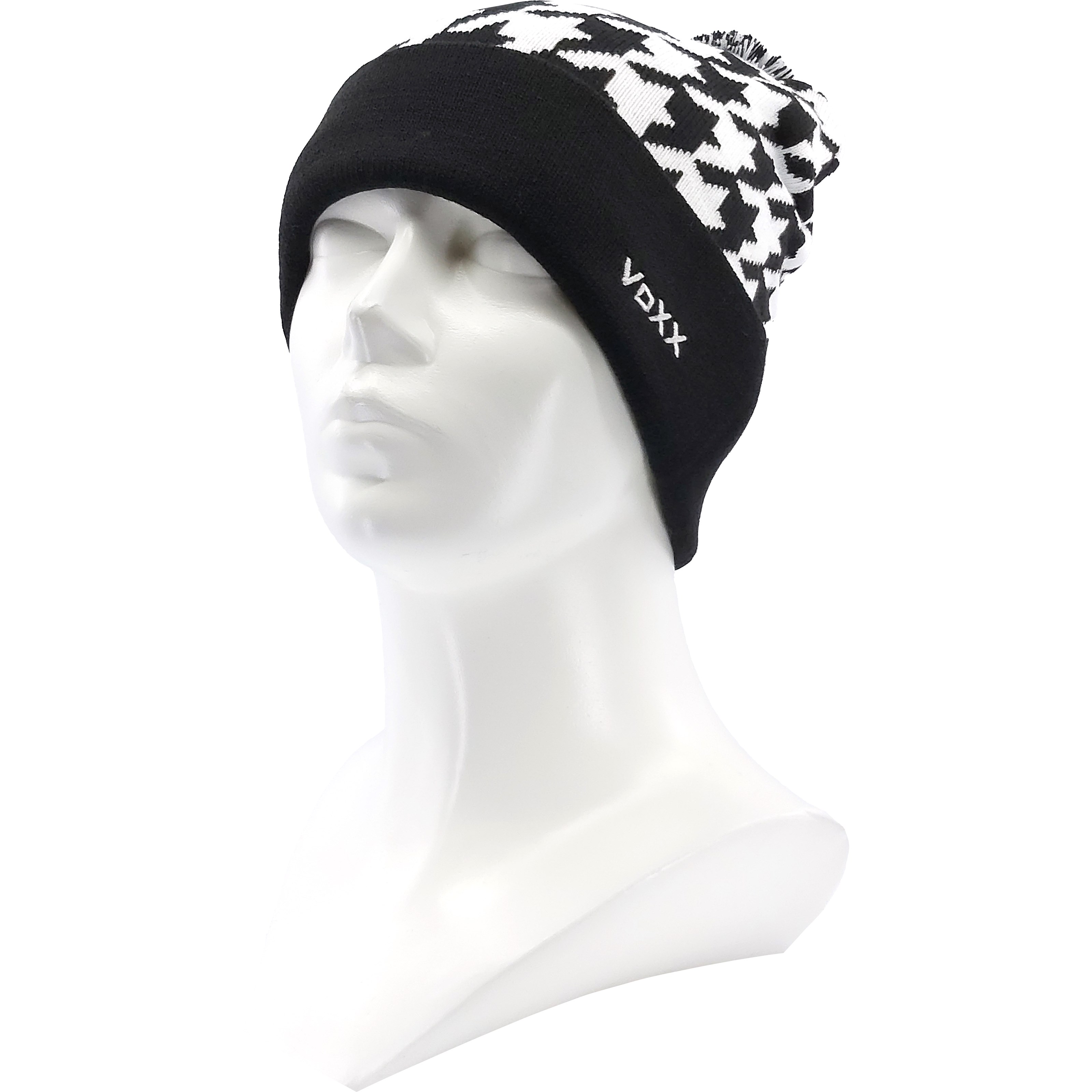 Men's knitted hat VoXX® JUKE in a retro pattern. The rooster footprint design is complemented by a wide black turn-up brim with embroidered VoXX lettering and a mottled pom-pom.