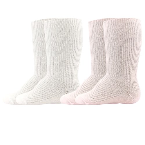 Thin cotton socks made of ribbed knit with elastane are comfortable on the skin, yet flexible and retain their shape well. Cotton is a natural material that is gentle on the skin and absorbs moisture well. These single-colour socks can be worn rolled up for a decorative look or pulled down completely. Because the socks are taller, they won't slip down your baby's feet. We offer them in a great value set of 2 pairs, white combined with blue for boys or pink for girls.